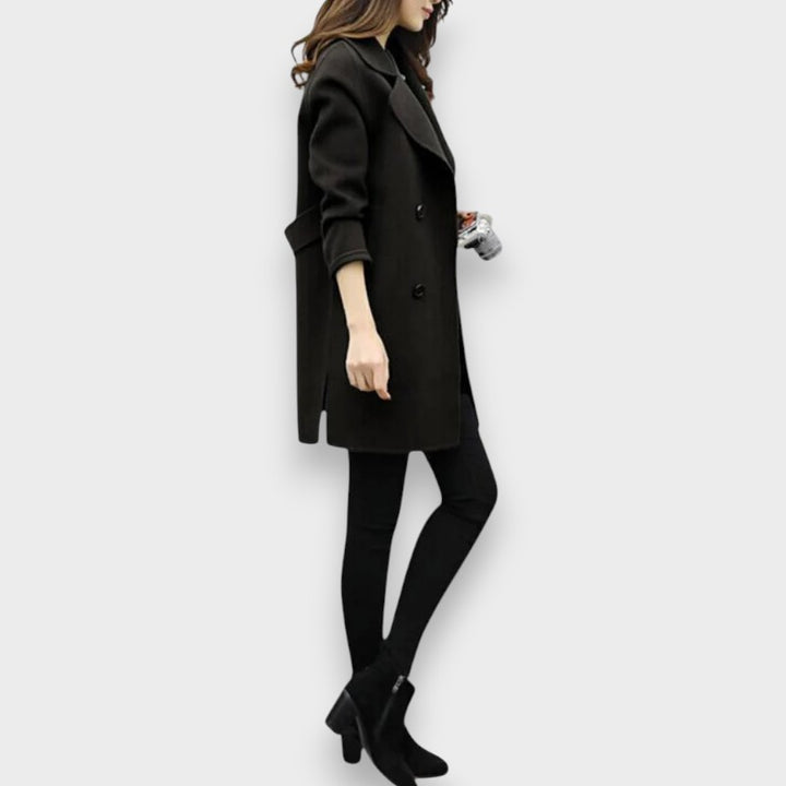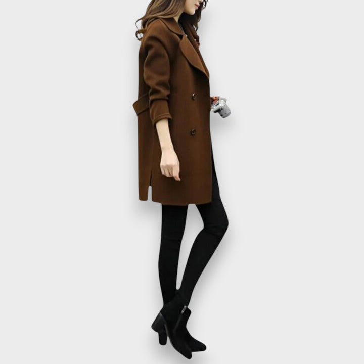 - Silueta i finiš: Kaput do koljena s dvostrukim kopčanjem i čistim linijama osigurava urednu, laskavu siluetu.