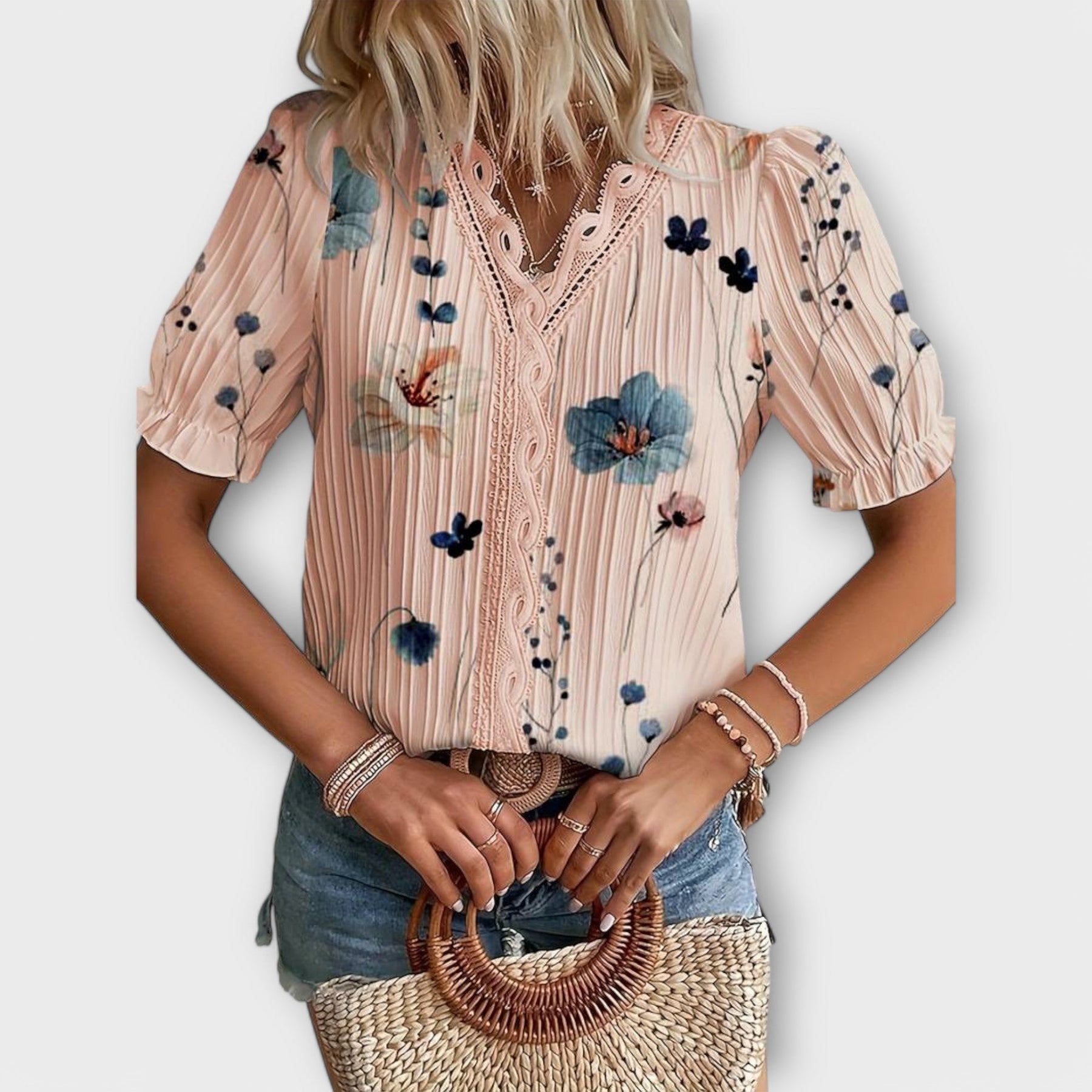 Delikatna i puna šarma, ova cvjetna bluza savršena je za one koji vole romantičan izgled bez kompromisa kada je u pitanju udobnost. Blagi kroj, čipkasti detalj na izrezu i laganost tkanine čine ovu odjeću idealnom za lagane i očaravajuće kombinacije — savršena za sunčane dane ili posebne trenutke.