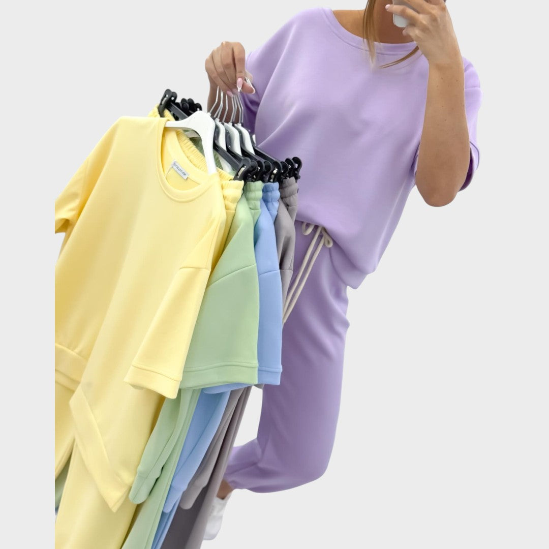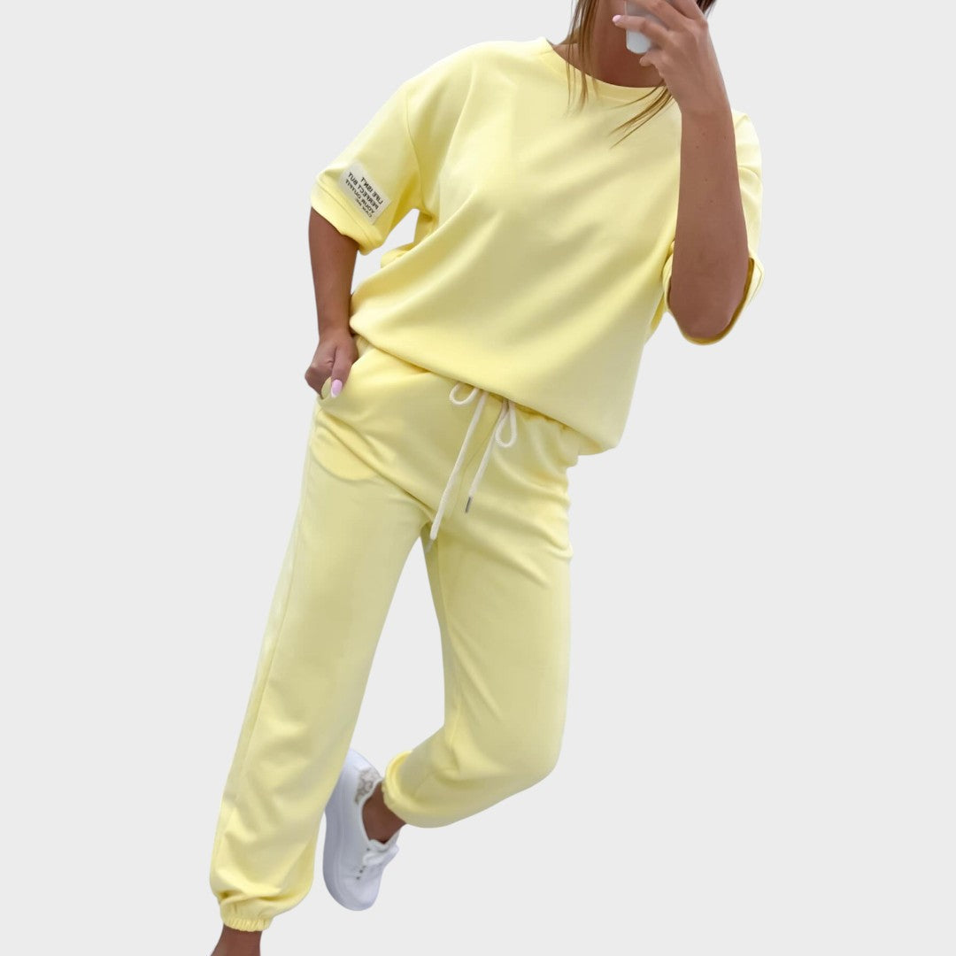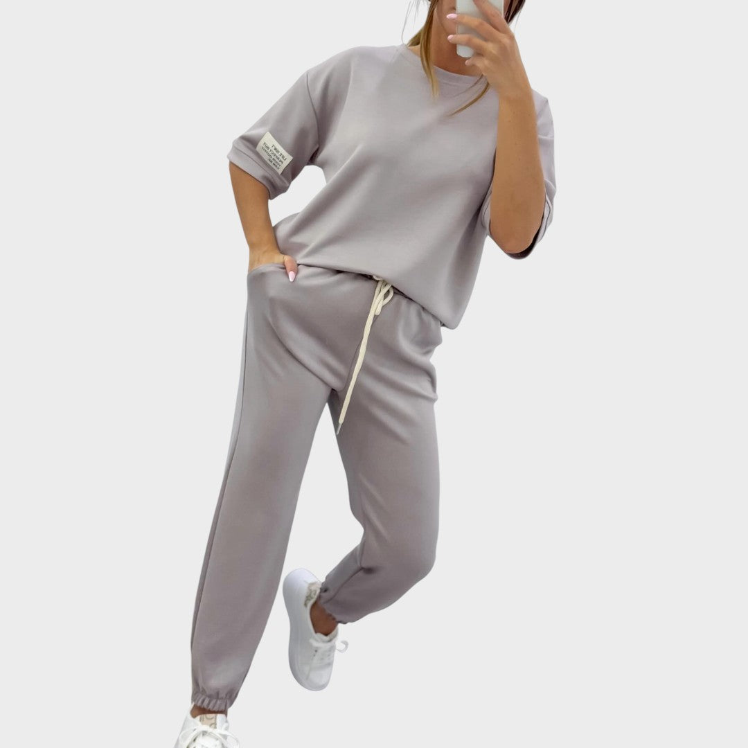 Minimalistički, 2-dijelni komplet za svaki dan. Opuštena majica s kratkim rukavima i spuštenim ramenima uparena je s jogger hlačama s elastičnim strukom na vezicu, bočnim džepovima i manšetama na gležnjevima. Glatka, mekana tkanina s blagim rastezanjem pruža udobnost kod kuće, na putu ili u gradu.