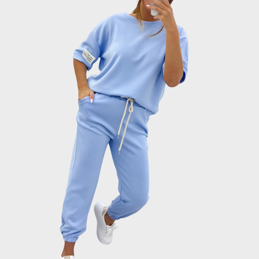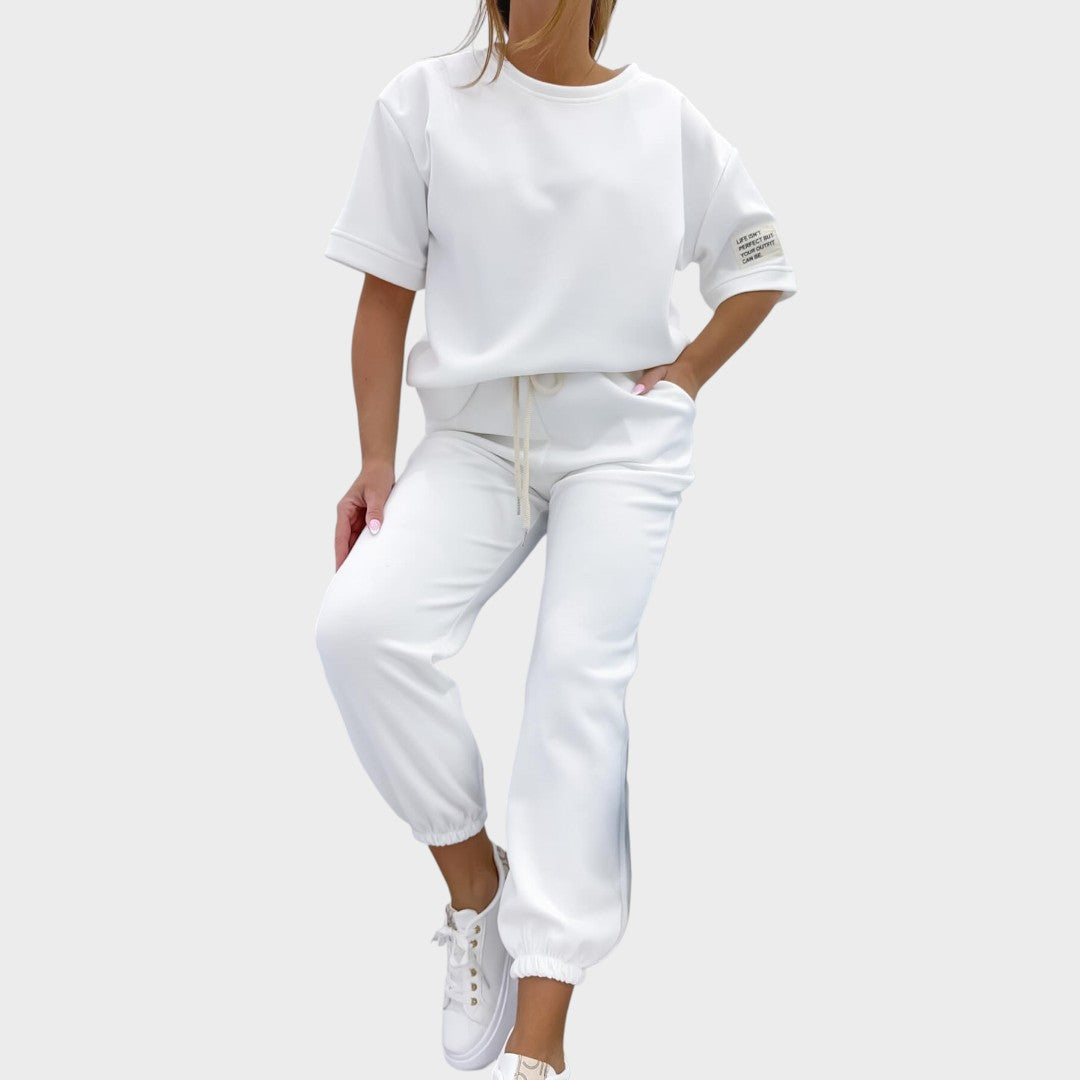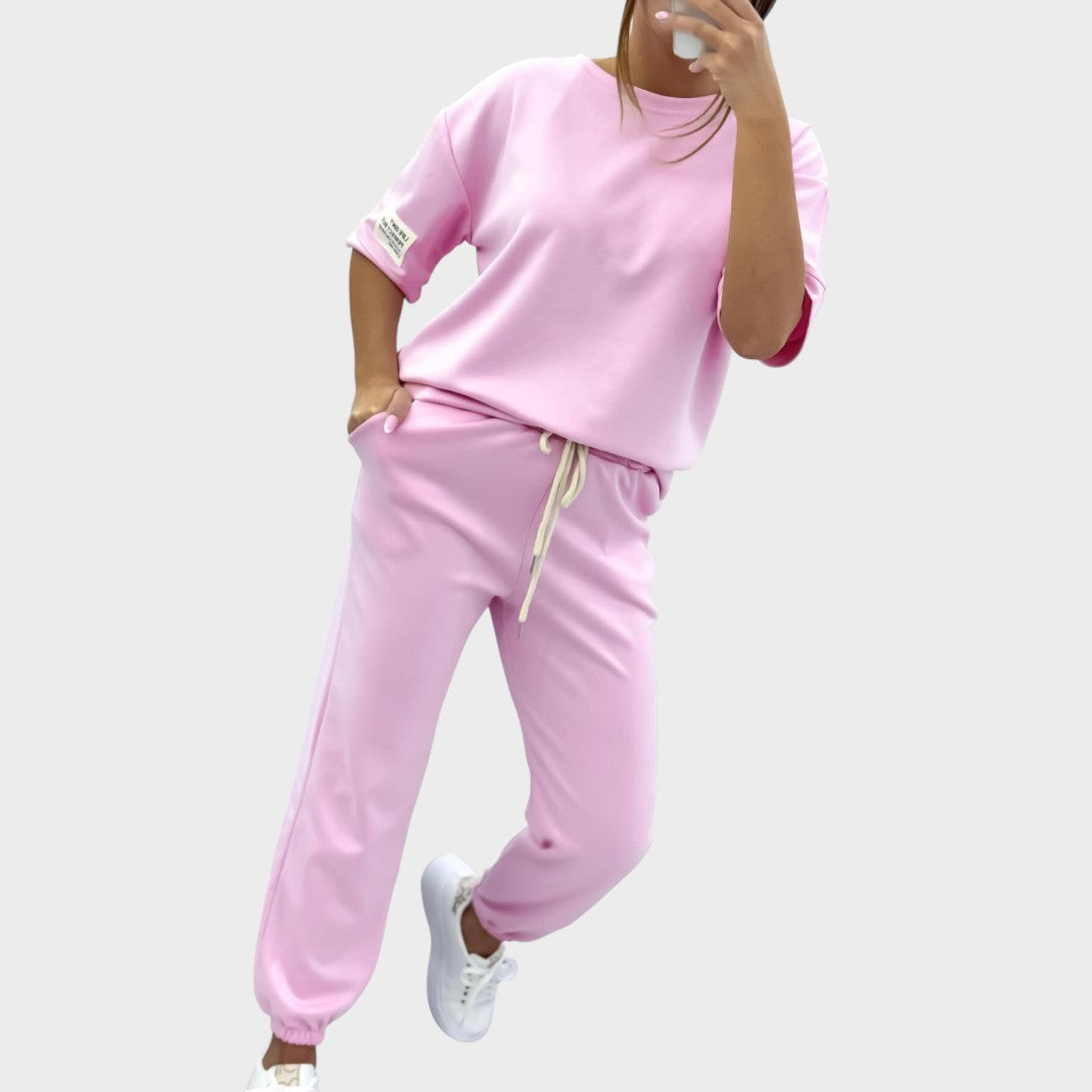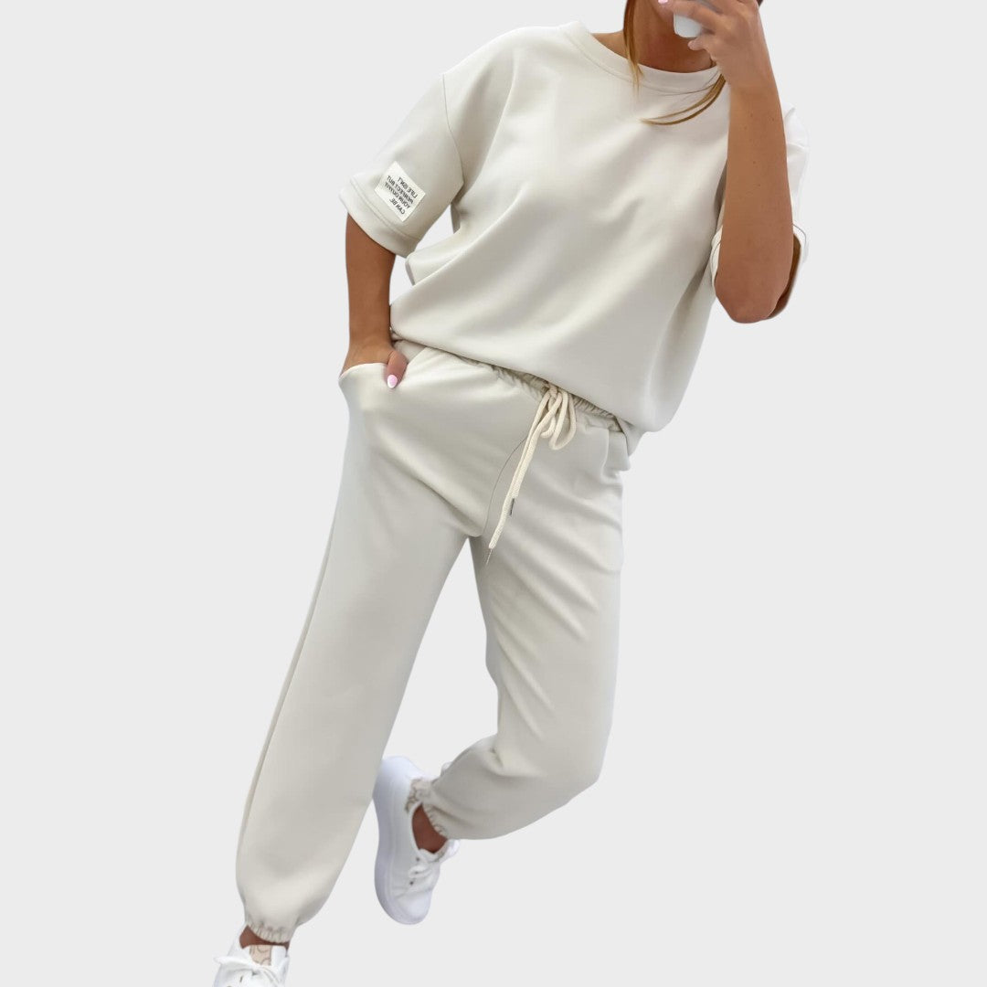 Minimalistički, 2-dijelni komplet za svaki dan. Opuštena majica s kratkim rukavima i spuštenim ramenima uparena je s jogger hlačama s elastičnim strukom na vezicu, bočnim džepovima i manšetama na gležnjevima. Glatka, mekana tkanina s blagim rastezanjem pruža udobnost kod kuće, na putu ili u gradu.