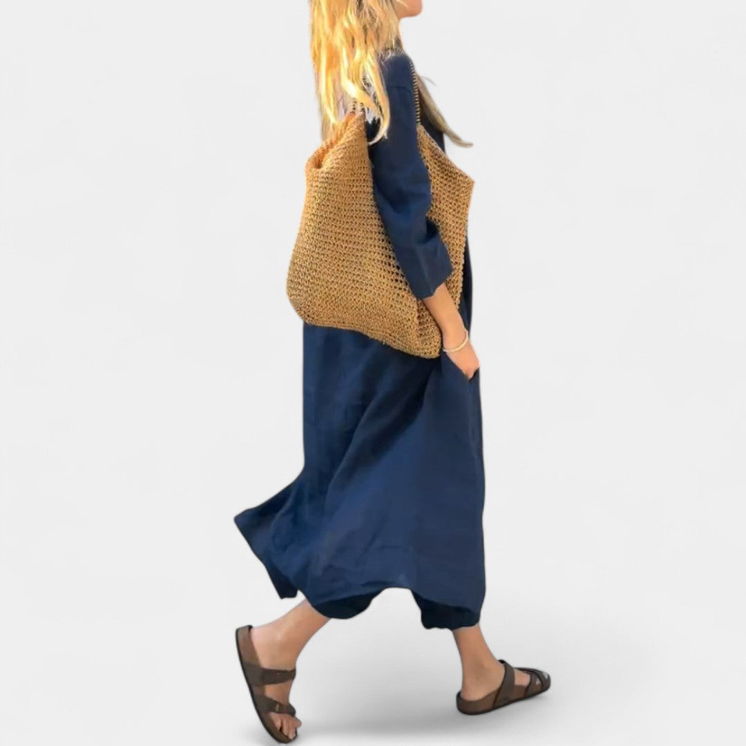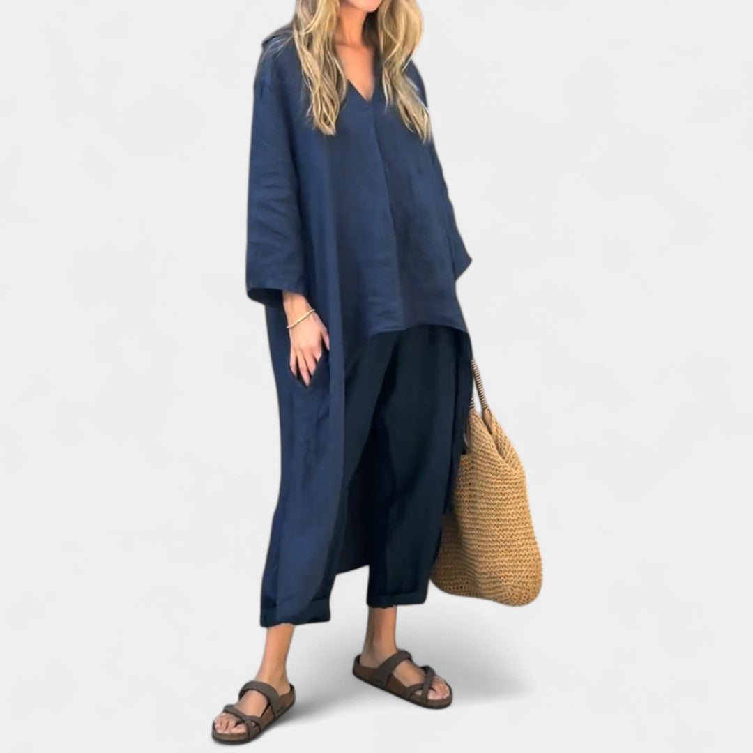Ovaj komplet odiše ležernošću i elegancijom u isto vrijeme. Široke hlače i tunika opuštenog kroja pružaju potpunu slobodu pokreta i maksimalnu udobnost, dok sofisticirani dizajn čini da izgledate moderno bez napora. Idealno rješenje za šetnje, putovanja, posao ili opuštena druženja – uvijek ćete izgledati dotjerano i s lakoćom.
