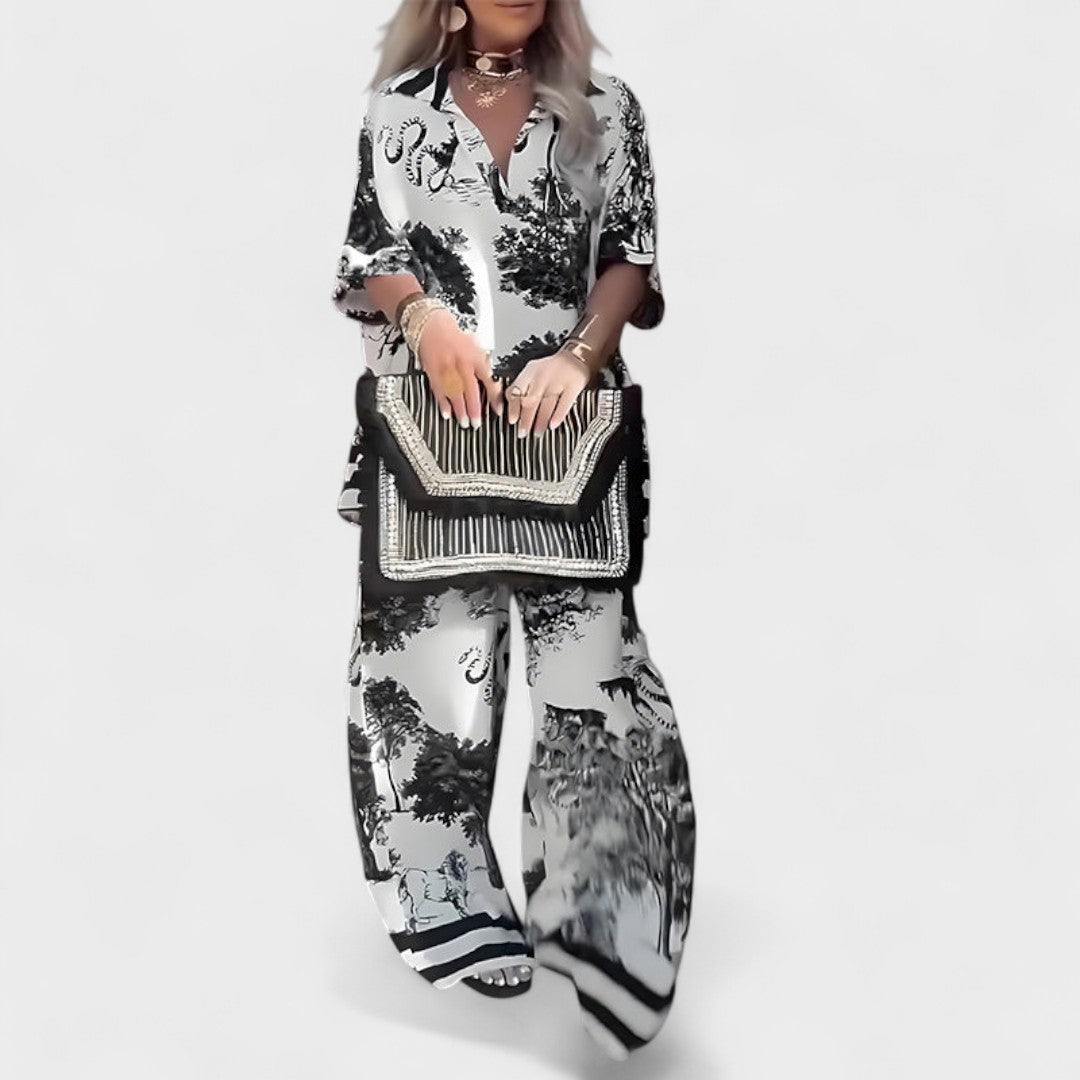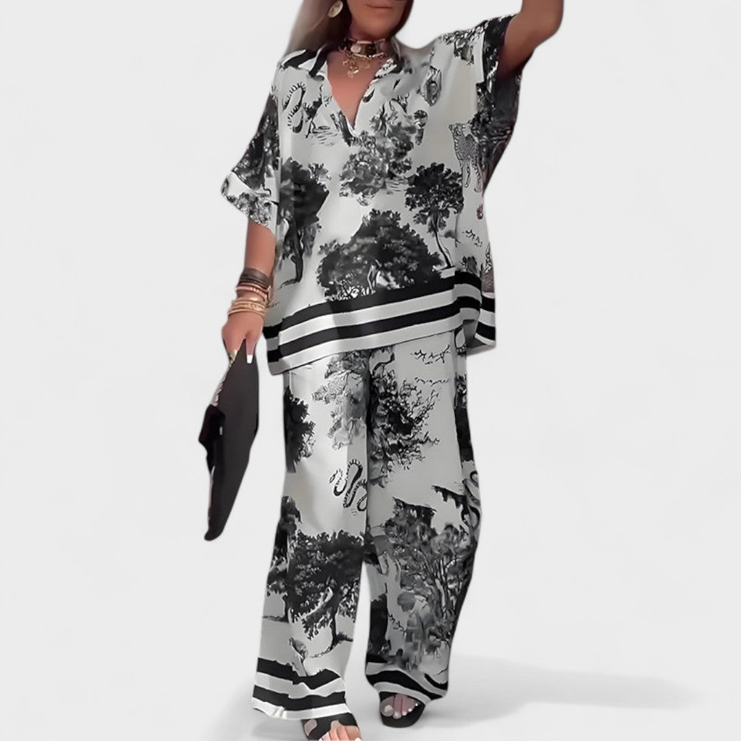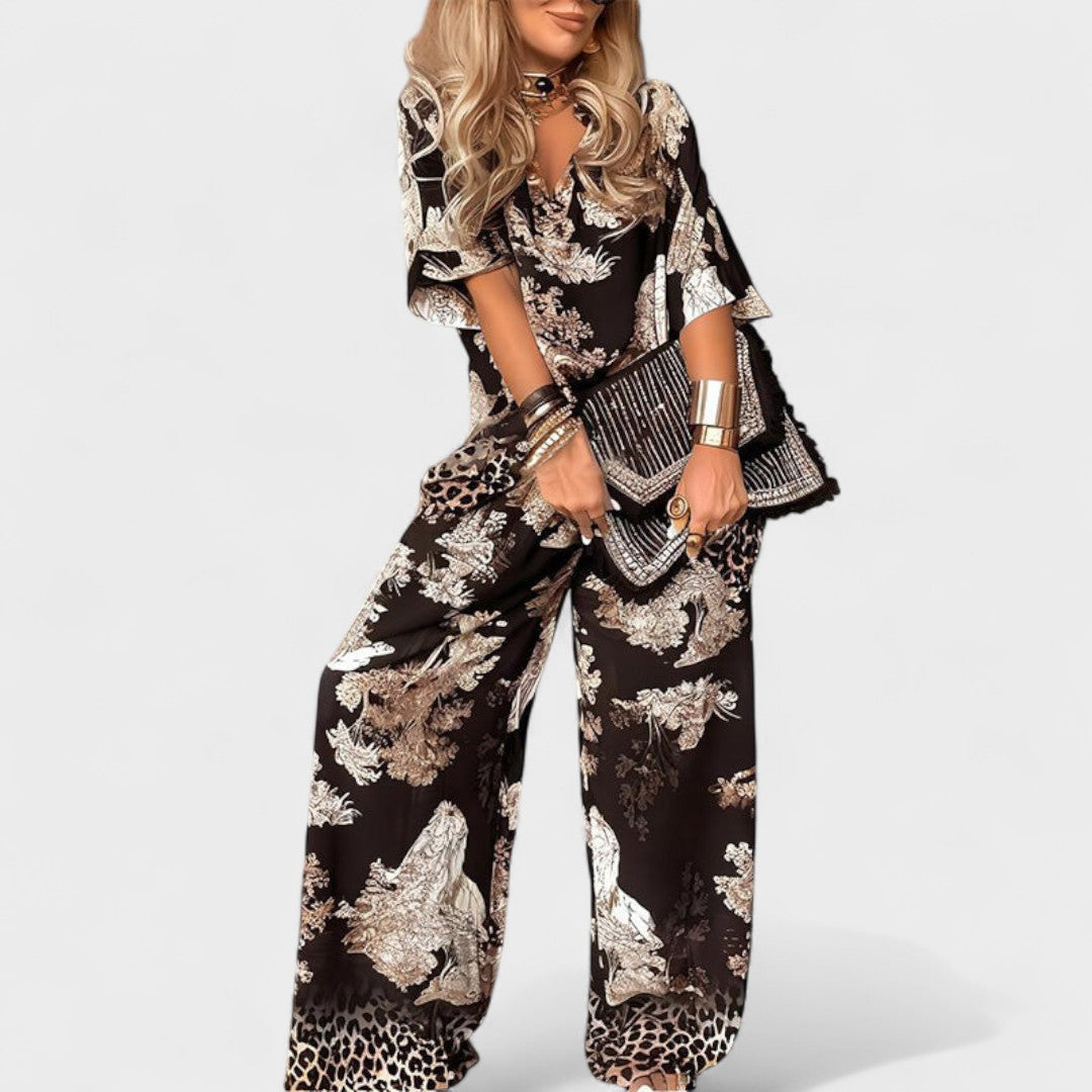 Ovaj komplet s V-izrezom savršeno spaja eleganciju i udobnost. Profinjeni kroj i lepršav dizajn pružaju maksimalnu slobodu pokreta, dok detalji unose dozu luksuza i originalnosti. Idealno rješenje za dnevne kombinacije, večernje izlaske ili posebne prigode kada želite izgledati moderno i samouvjereno.