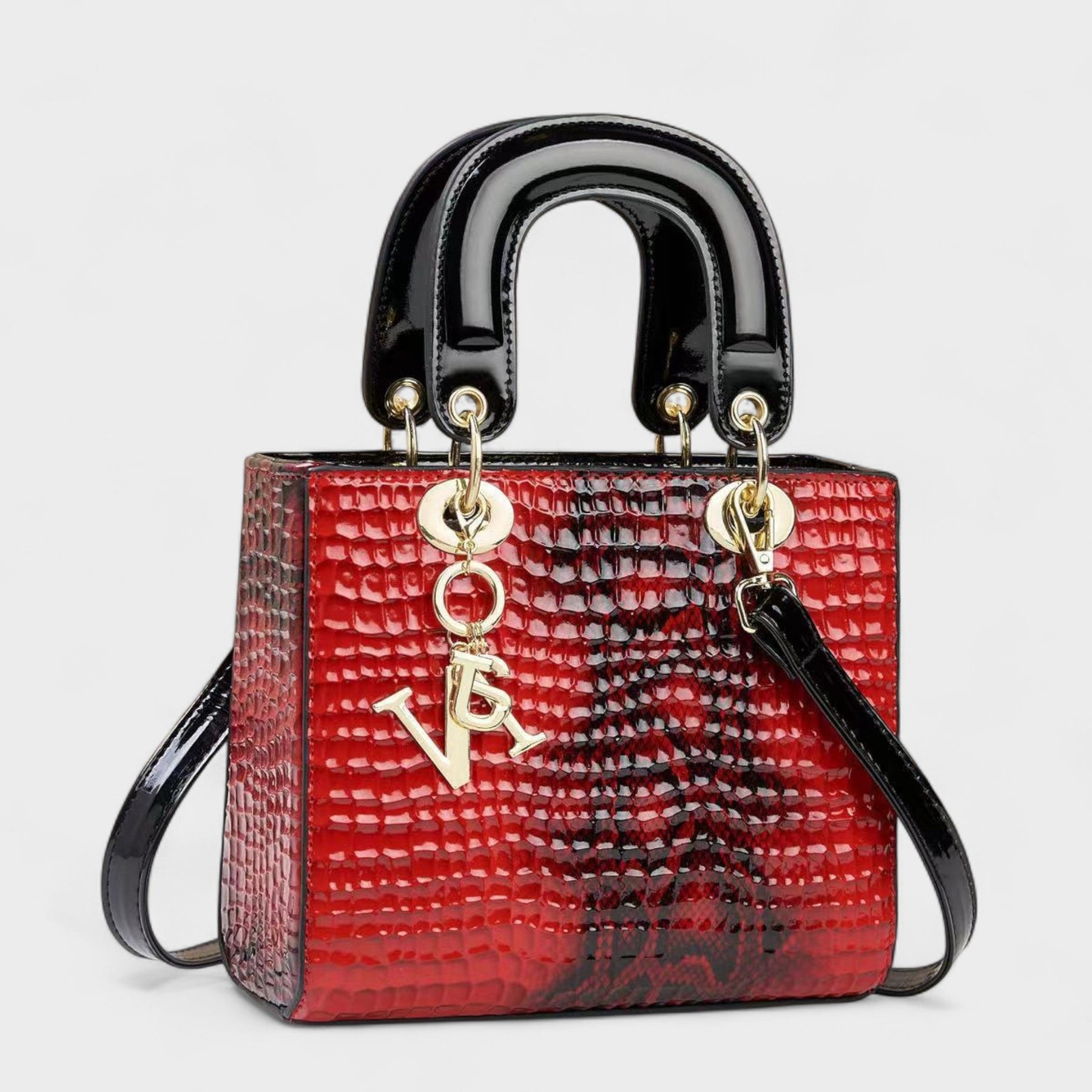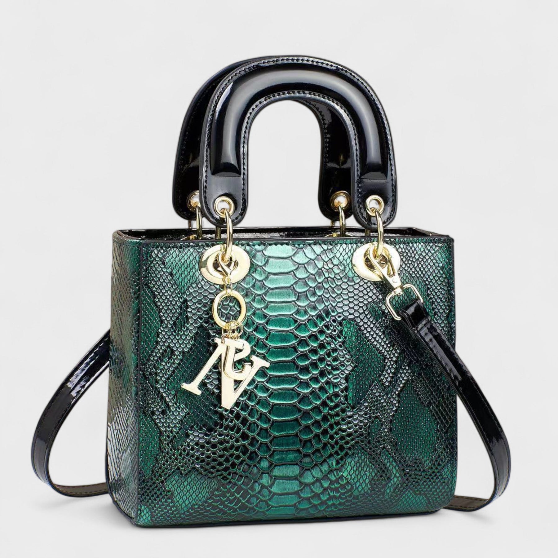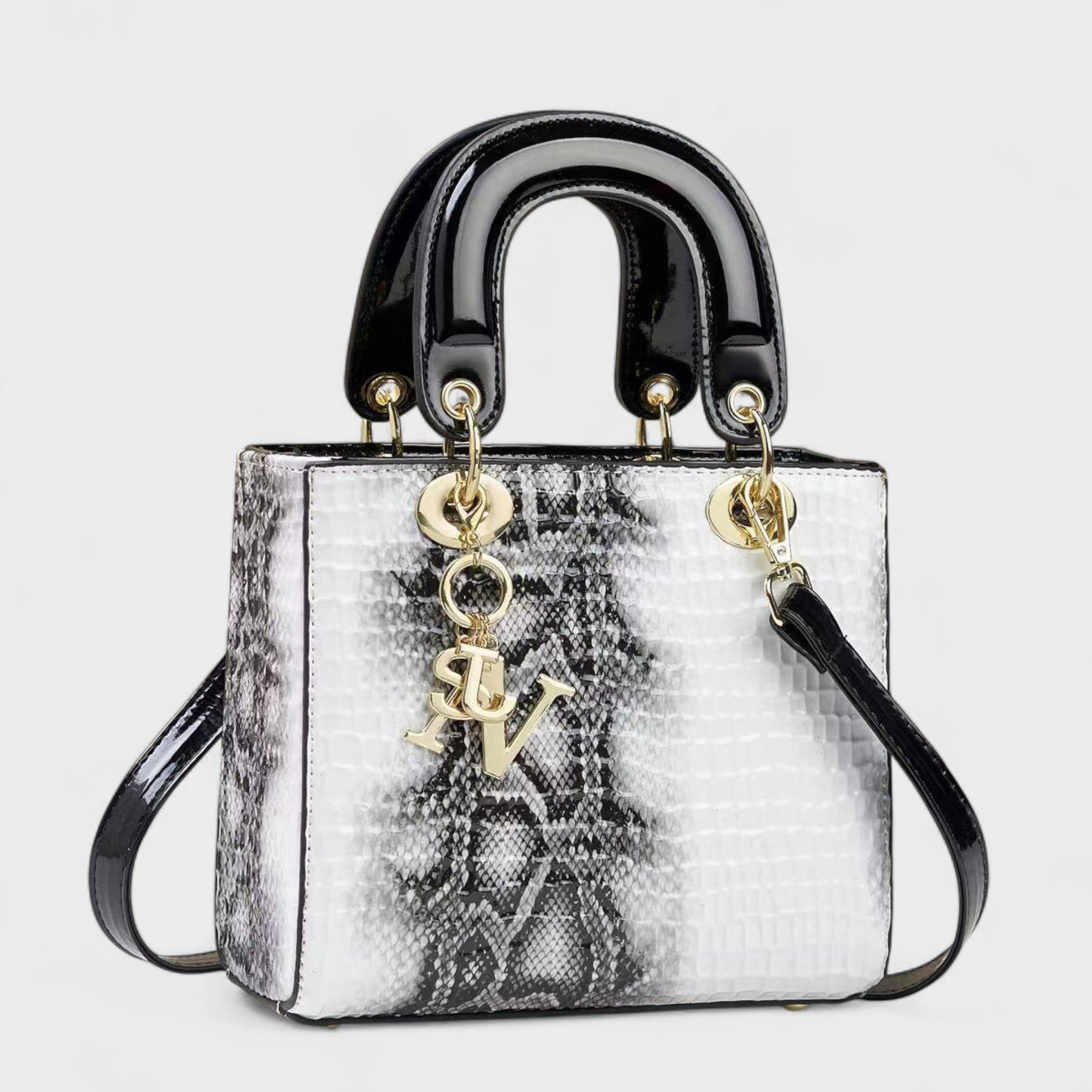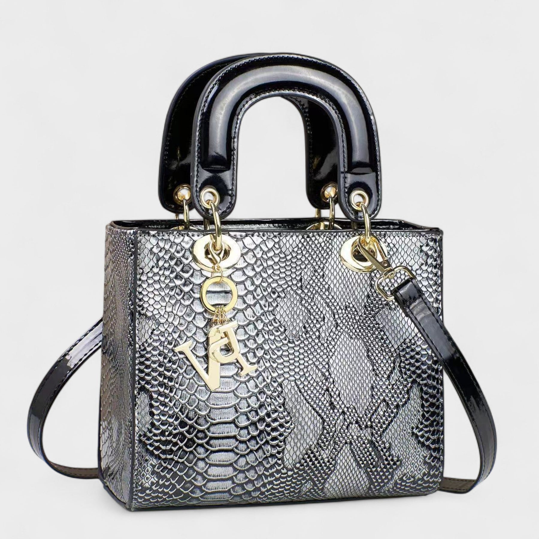 Sa sofisticiranim završetkom u životinjskoj teksturi i metalnim dijelovima visokog sjaja, ova torba je definicija profinjenosti. Strukturirana, s dvostrukim ručkama i dugom uklonjivom trakom, nudi svestranost koja odgovara od formalnih događaja do ležernih trenutaka sa stilom. Aksesor koji trenutno podiže svaku kombinaciju, donoseći šarm i autoritet.